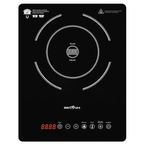 Cooktop de Indução Britânia BCT14P com 10 níveis de potência e temperatura, timer de até 180 minutos, display digital, painel touch, reconhecimento de panelas com fundo magnético, desligamento automático de segurança e base em vidro cerâmico.Luz de calor residual