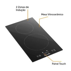 Características Gerais do produto Cooktop de Indução Mueller cometros 2 bocas, painel touch, metrosesa vitrocerâmetrosica de alto brilho, timetroser digital cometros alerta sonoro e trava de segurança.