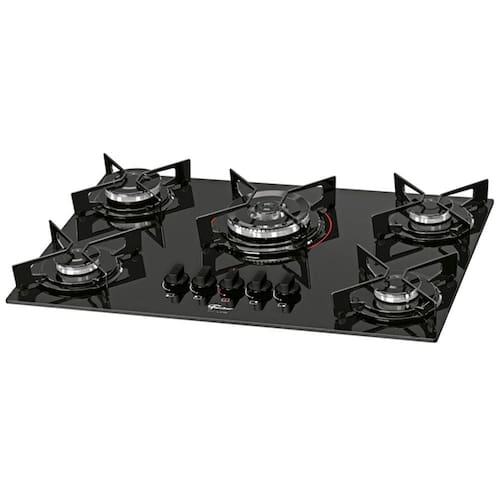 CARACTERÍSTICAS: - Mesa de vidro temperado na cor preta - Suporte da trempe em easy clean preto - Trempe individual com novo design, esmaltada - Manipuladores (botões) de nylon preto - Queimadores com tecnologia italiana de alta eficiência e durabilidade (SABAF) - 5 queimadores: 1 queimador tripla chama (3700W), 1 queimador rápido (3000W) e 3 queimadores semi-rápidos (1750W) - Câmara de gás fechada: a chama não se apaga com facilidade - Fundo compacto, otimiza o espaço do armário/nicho - Acendimento superautomático - Produto Certificado pelo INMETRO (Portaria 400)