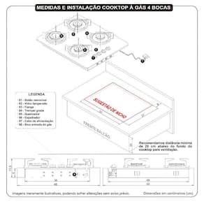 Cooktop Fogatti 4 bocas à gás com trempes em ferro fundido, acendimento superautomático, mesa de vidro temperado, sistema anti-rotação nas trempes e certificação CONPET A.Luz de calor residual