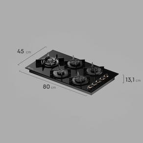 "Adicione um toque de sofisticacao e eficiencia a sua cozinha com o Cooktop a Gas 5 Bocas Preto da linha Pro Series da Electrolux, modelo KE5PS. Com um design elegante na tonalidade preta e acabamento em vidro, este cooktop nao apenas eleva a estetica da sua cozinha, mas tambem oferece durabilidade e facilidade de limpeza. Com dimensoes de 13,1x80x45 cm e peso de 12,50 Kg, este cooktop e projetado para se encaixar perfeitamente em um nicho de 76 cm de largura e 39 cm de profundidade.