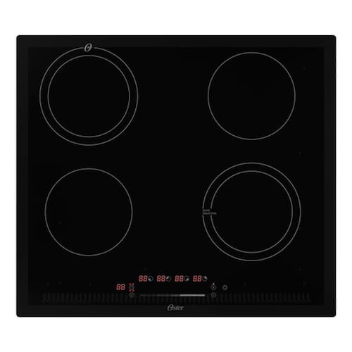 Cooktop de Indução Oster com 4 bocas, painel touch, 9 níveis de potência, função de bloqueio de segurança e superfície de vidro preto.Alimentação