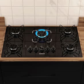 Cooktop Itatiaia Essencial 5 bocas com mesa de vidro temperado, trempes individuais esmaltadas, acendimento automático e queimadores de alumínio. Bivolt.Luz de calor residual