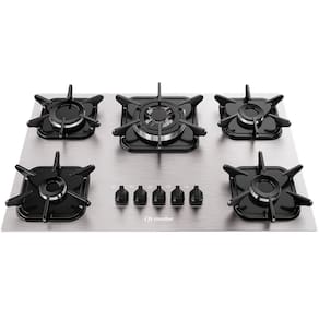 Ele ainda possui 1 Queimador Tripla Chama de 3600 Watts de potência, 1 Queimador Ultra Chama de 2400 Watts de potência, 2 Queimadores semirrápidos de 1700 Watts de potência e 1 Queimador Auxiliar 1000 Watts de potência. Para cada um é indicado o tamanho ideal de panela.