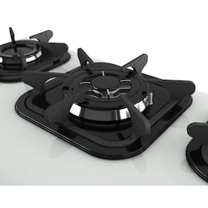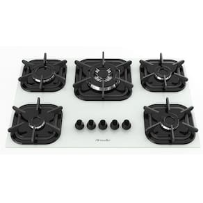 Características: Tensão bivolt Tipo de Gás GLP (Conversível para GN) Vidro temperado Tipo de acendimento: Superautomático 1 queimador Tripla Chama 3600 watts de potência 1 queimador Ultra Chama 2400 watts de potência 2 queimadores Semirrápidos 1700 watts de potência 1 queimador auxiliar 1000 watts de potência