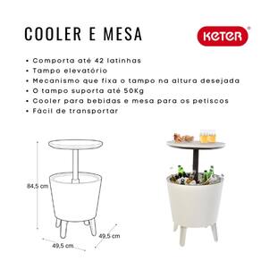 Cooler Mesa Bistrô com Iluminação LED Keter | Exclusividade com Estilo e Funcionalidade|Conheça o Cooler Mesa Bistrô Iluminado com LED da Keter, uma exclusividade que une design premiado, praticidade e inovação para tornar seus momentos ao ar livre ainda mais especiais. Ideal para varandas, jardins, festas e churrascos noturnos, este produto oferece o equilíbrio perfeito entre mesa de apoio, balde térmico e iluminação ambiente.||Com estrutura inspirada no clássico Cool Bar Keter, o modelo iluminado conta com LEDs recarregáveis embutidos que realçam a experiência noturna com charme e sofisticação. A cuba térmica de 37L mantém suas bebidas geladas por até 12 horas, enquanto o tampo retrátil pode ser elevado até 84,5 cm para se transformar em uma mesa estilo bistrô.||Beleza, praticidade e inovação em um só produto. Seja para servir petiscos ou manter as bebidas sempre à mão, o Cooler Bistrô com LED é a escolha ideal para anfitriões exigentes e eventos memoráveis.||Diferenciais do Produto|Exclusivo da Keter: modelo iluminado com LED recarregável embutido|3 em 1: cooler, mesa de apoio e peça decorativa com iluminação|Tampo retrátil: eleva-se até 84,5 cm, transformando-se em mesa bistrô|Cuba térmica de 37L: armazena até 42 latas (aproximadamente)|Isolamento térmico: mantém as bebidas geladas por até 12 horas com a tampa fechada|Válvula de escoamento: facilita a drenagem da água após o uso|Fácil de limpar: não enferruja, não mancha e pode ser lavado com água|Visual moderno: ideal para compor ambientes externos com elegância||Medidas do Produto|Fechado: 49,5 cm (A) x 49,5 cm (L) x 57 cm (P)|Com tampo elevado: altura total de 84,5 cm|Capacidade: 37 litros|Armazena até: 42 latas (aproximadamente)||Dados de Embalagem|Peso total: 6 kg|Altura: 50 cm|Largura: 50 cm|Profundidade: 41 cm||SKU: 17204184|EAN: 7290106933866||Informações Importantes||Produto promocional: condições válidas enquanto durarem os estoques|Preços e condições válidos apenas para compras no site Keter Online|Não requer montagem: siga apenas as instruções de uso do fabricante|Evite produtos químicos na limpeza: utilize apenas água|Consulte nossa política de trocas e devoluções para garantir seus direitos