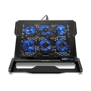 Superfície de metal permitindo que o equipamento resfrie rapidamente, contendo 2 portas USB, 5 ângulos ajustáveis, Led luminoso, Funciona com até 17, painel de controle, 6 coolers com 7 cm.