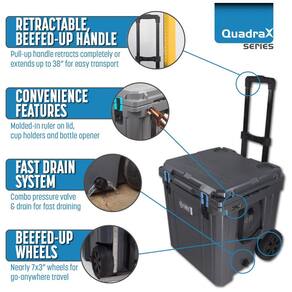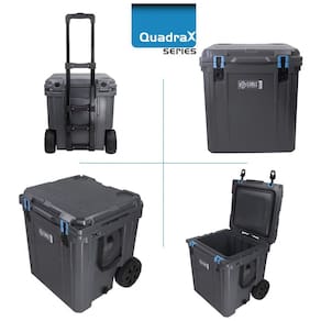 RETENÇÃO DE FRIO DE 5 DIAS O refrigerador de rolamento QuadraX manterá seu conteúdo fresco por até 5 dias com nosso design lateral de parede grossa com de isolamento superior impressionante capacidade de carga de até 26 latas com uma proporção recomendada de 21 gelo, conteúdo. PORTÁTIL E RESISTENTE Construção rotomoldada, este cooler ártico é virtualmente indestrutível tem uma alça telescópica retrátil, rodas de 17x e alças laterais para facilitar o transporte, seja para pescar, fazer uso não autorizado, acampar ou fazer churrasco no quintal INTEGRADOS FUNCIONAIS Nosso design de refrigerador de acampamento é extremamente prático e versátil com dois porta copos embutidos, uma régua de peixe na parte superior da tampa e um abridor de garrafas embutido na lateral. SISTEMA DE TRAVA A trava de tensão de captura rápida trava e protege facilmente a tampa, enquanto a junta de silicone mantém o frio e evita vazamentos este refrigerador de latas também é equipado com um sistema de válvula e bujão de drenagem dupla rápido e conveniente Marca: Não Informado