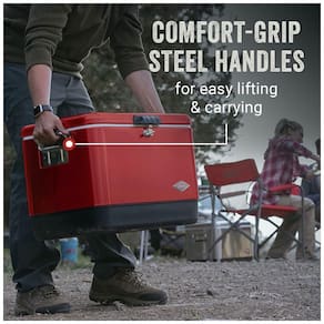 O refrigerador de alta capacidade e resistente apresenta um design retrô encantador. A capacidade de 54 litros acomoda até 85 latas. As peças de plástico do refrigerador incluem os bujões de drenagem, dobradiças e alças. O isolamento premium oferece retenção de gelo de 4 dias. Construído para oferecer anos de desempenho com hardware de aço inoxidável resistente à ferrugem. Alças de aço de aderência confortável permitem levantamento e transporte fáceis e controlados Marca: Não Informado