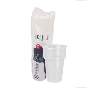 O pacote é embalado em sacos plásticos separados, contendo 25 copos plásticos cada, facilitando o manuseio e o armazenamento.