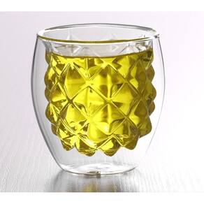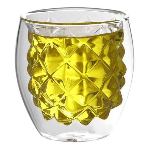 Copo com paredes duplas e interior no formado da casca do abacaxi. Não permite que a temperatura da bebida passe para a sua mão.