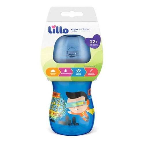 O copo evolution da Lillo possui tampa com fechamento eficaz e mantém o bebedor protegido durante os passeios, permite uma alimentação mais confortável com a válvula de saída de ar, diminuindo a formação e a ingestão de bolhas de ar durante a alimentação. Além disso, conta com um bebedor macio, com área de toque confortável para as gengivas e lábios e um sistema antivazamento impedindo que o líquido saia sem que a criança sugue, evitando bagunça. Feito com material resistente que oferece segurança contra quebra e base larga para apoio dos lábios oferencendo uma alimentação segura e agradável.