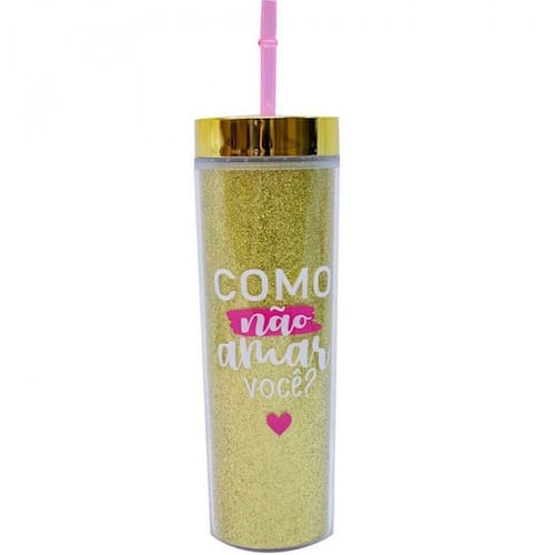 Copo no formato cilíndrico e com um revestimento de purpurina brilhante toda na cor dourada e gravado com a frase Como não amar você. Esse copo é show. Indicado para quem tem bom gosto. ; Instruções de conservação: Lavar com água, esponja macia e detergente neutro. Não vai ao lava-louças, nem ao micro-ondas. Teme químicos e abrasivos. Atenção: não coloque o produto na geladeira ou no congelador. Choques ou quedas podem danificá-lo. Para evitar vazamentos, carregue o produto apenas na posição vertical. Características Tamanho: Altura: 21 cm | Largura: 87 cm | Profundidade: 7 cm | Capacidade: 450ml Ficha técnica - Cor: Dourado Marca: Fings Store