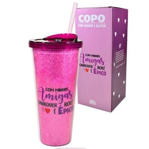 Copo Canudo Com Glitter Amigas Rosa 650Ml