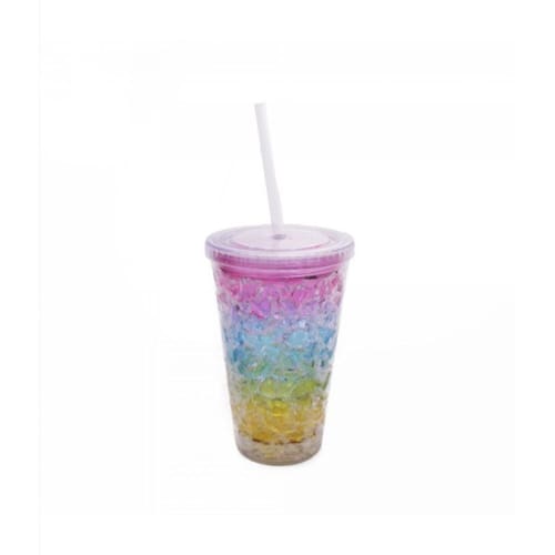 Com capacidade para 420 ml, vem com tampa e canudo, e uma combinação com as cores amarela, verde, azul e rosa.