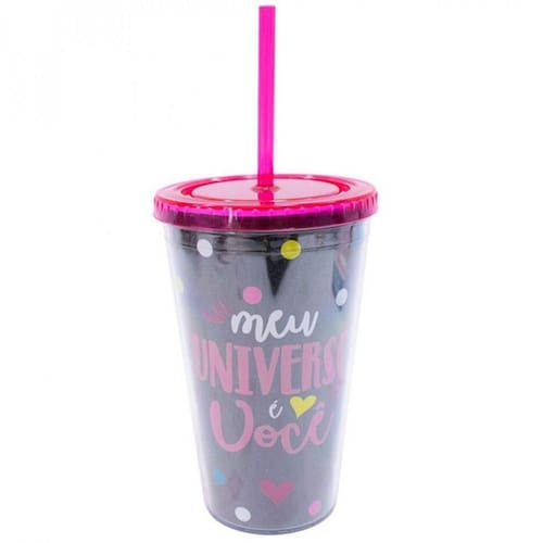 A Fings Store é uma loja recheada de novidades todos os dias. Venha conhecer esse copo com canudo e tampa pink revestido de purpurina brilhante, gravado com a frase Meu universo é você. É feito de um plástico resistente trazendo segurança e durabilidade. Instruções de conservação: Lavar com esponja macia e sabão neutro. Não utilizar produtos químicos ou abrasivos. Características Tamanho: Altura: 16 cm | Largura: 10 cm | Profundidade:/ 10 cm | Capacidade: 450 ml Marca: Fings Store