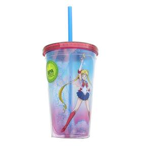 - O copo apresenta Sailor Moon com um design elegante de fundo de renda.