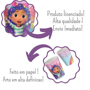 Na kibunitinho você encontra o tema A Casa Mágica da Gabby, utilize os Copos de papel tema Festa A Casa Mágica da Gabby, na hora servir seus convidados, os Copos festa A Casa Mágica da Gabby pode compor a decoração da mesa, uma dica é dar de lembrancinha com doces, embrulhado no plástico transparente e fita.