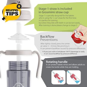Grosmimi Os copos de palha PPSU são fáceis de usar. Eles não vazam quando sacudidos e os canudos de silicone são macios que os bebês podem sugar facilmente. São adequadas para bebês após seis meses. O copo vem com kit de canudo Stage-1. - Tipo de ocasião: Todos os dias - Instruções de cuidados: Lavar à máquina - Estilo: Talheres - Material: Polifenilsulfona (PPSU) - Capacidade: 295 ml - Forma do item: Redondo - Tipo de padrão: Sólido