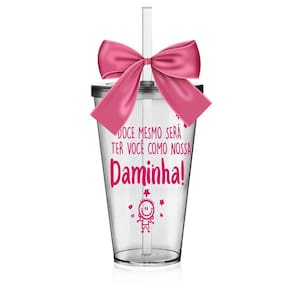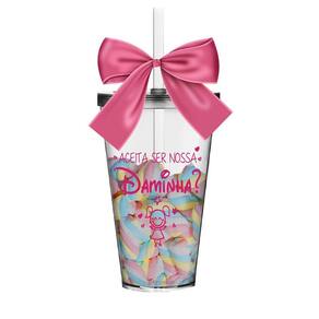 O Copo Convite é uma forma linda e deliciosa de convidar ou agradecer os pequenos por participarem de uma data tão única Com capacidade de 550 ml, você tem a opção de encher os copos com todo tipo de doce e assim encantar a futura Daminha O sim dela será GARANTIDO Personalize também do seu Jeito 1 Copo Convite com Tampa e Canudo Transparente com 1 Laço em Cetim Rosa. Capacidade: 550 ml Material Copo: Acrílico Poliestireno Resistente Laço: Cetim Cor do Copo: Transparente Tampa e Canudo: Transparente Personalização: Transfer Aplicação Direto no Produto Quantidade: 1 Peça Ean: 7897581919370