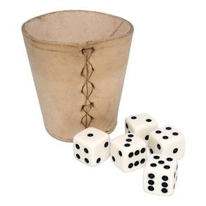 Características: Material: Copo Couro, dados Plástico Número de jogadores: livre. Dimensões do copo: Altura: 8 cm Diâmetro da boca: 8 cm Diâmetro da base: 6 cm Dimensões dos dados: 12 mm