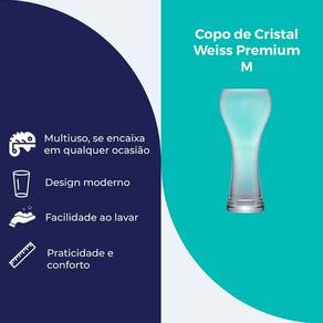 O formato do copo de cristal Weiss Premium permite com que se destaque o elegante colarinho que se forma à medida que a cerveja é servida. Esse copo possui a boca larga, um estreitamento em direção à base e capacidade para uma garrafa de cerveja long neck. É o copo ideal para evidenciar a concentração de aromas e espuma, presente nas cervejas de trigo.
