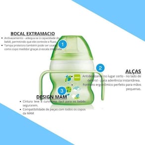 Uma característica única deste copo é a sua alça, que brilha no escuro. Isso facilita a sua localização durante a noite, proporcionando praticidade para os pais e autonomia para o bebê. As alças são antideslizantes e compatíveis com todos os copos da Mam.