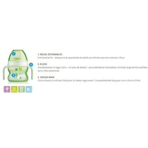 Características: 1. BOCAL EXTRAMACIO Antivazamento - adequa-se à capacidade do bebê, permitindo que ele controle o fluxo 2. ALÇAS Antideslizante no lugar certo - no lado de dentro! - para aderência instantânea. Formato ergonômico perfeito para mãos pequenas 3. DESIGN MAM Cintura leve e curvilínea: fácil para os bebés segurarem. Compatibilidade de peças com o Fun to Drink