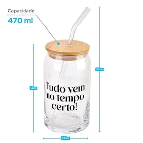 - Capacidade 470ml - Design Atraente: frases para inspirar seus dias. - Material eco: Vidro e tampa de bambu durável - Praticidade: Canudo de vidro incluído. - Versatilidade: Perfeito para sucos, smoothies e outras bebidas refrescantes. Marca: Não Informado