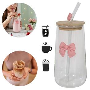 Estilo Único: O design com arco e gravata borboleta adiciona um "senso de ritual", transformando o hábito de beber em uma experiência de luxo. Copo De Vidro Fofo Com Tampa E Canudo Laço De Coquette 500ml
