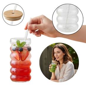 ECO-FRIENDLY E REUTILIZÁVEL: Substitua os copos descartáveis por uma opção sustentável de vidro premium, fácil de lavar e que não retém odores ou sabores. Copo De Vidro Forma de Onda com Tampa E Canudo Gomado 550ml