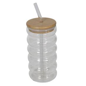 Copo de Vidro Ondulado Premium com Tampa de Madeira e Canudo - 550ml