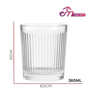 Copo de vidro com capacidade de 360ml da marca Em Casa Tem, ideal para o uso diário ou ocasiões especiais. Fabricado em vidro de alta transparência, o modelo apresenta design cilíndrico com acabamento canelado em toda a superfície externa, proporcionando um visual moderno e elegante, além de facilitar a pegada.