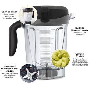 Projetado para processar grandes lotes com um design leve que cabe facilmente sob a maioria dos armários de cozinha. Material Copoliéster Eastman Tritan livre de BPA Compatível com máquinas da série G, Vitamix 5300. As lâminas de corte medem de diâmetro. Não é compatível com máquinas Vitamix Ascent Series. As lâminas no recipiente Vitamix atingem velocidades suficientemente rápidas para criar calor de fricção, levando ingredientes frios a vapor quente em cerca de seis minutos Cada recipiente Vitamix é claramente marcado com as medidas de onças e xícara. Até mesmo o plugue da tampa tem uma linha de medição de 60 ml Alça confortável e macia é fácil de segurar enquanto despeja ou usa a violação. Capacidade 1,8 l Marca: Não Informado