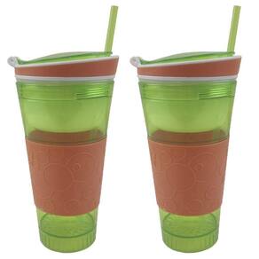 Capacidade de 500ml para bebidas e um pote acoplado com 200ml para lanches (frutas, biscoitos, etc).