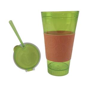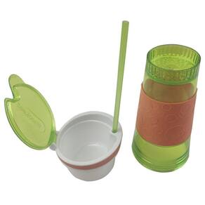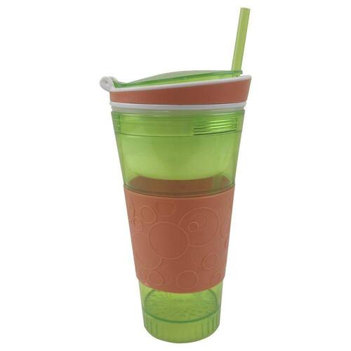 Capacidade de 500ml para bebidas e um pote acoplado com 200ml para lanches (frutas, biscoitos, etc).
