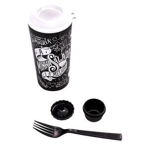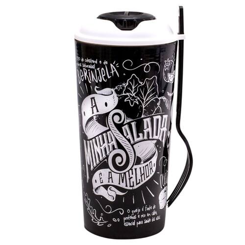 Altura: 18 cm Largura: 9 cm Capacidade: 600 ml Material: Plástico PP Conteúdo: 1 copo, 1 tampa, 1 molheira e 1 garfo