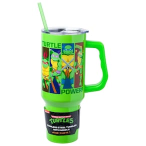 - TURTLE POWER: o copo temático apresenta Teenage Mutant Ninja Turtles, incluindo Leonardo, Donatello, Raphael e Michelangelo. Cada personagem é apresentado em um retângulo individual em uma pose incrível. Escrito no copo está “Turtle Power”. O design é apresentado em ambos os lados do copo verde.