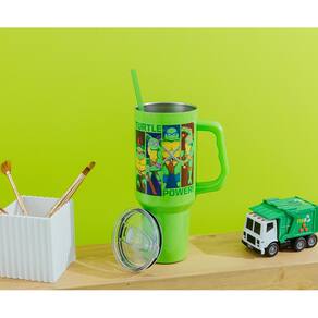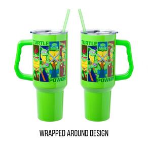 Copo de aço inoxidável Silver Buffalo Teenage Mutant Ninja Turtles Turtle Power com alça com Leonardo, Donatello, Raphael e Michelangelo, cabe em porta-copos padrão, 40 onças