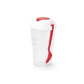 Este copo para salada é feito de plástico ps policarbonato de alta qualidade e tem capacidade para até 800ml. Em seu corpo, com design anatômico e moderno, é acoplado um prático garfo de plástico, não necessitando se preocupar em levar ou esquecer o seu talher. Possui uma tampa de encaixe para melhor acondimentar a sua salada e conta com um recipiente dedicado para o molho da sua salada com capacidade para 60ml.
