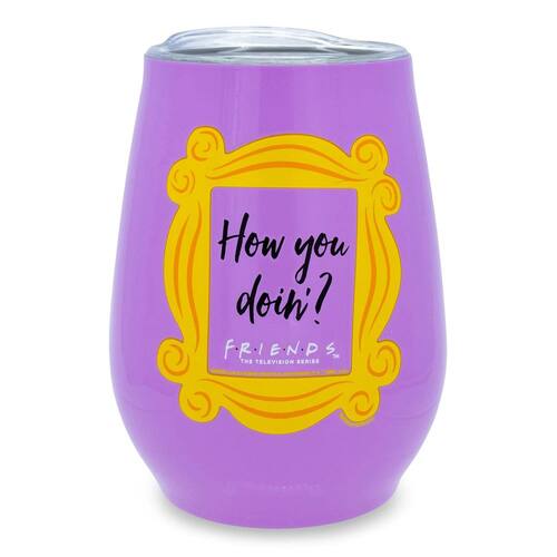- Copo de aço inoxidável de parede dupla: nosso copo comporta 290 ml da sua bebida favorita. Mantenha sua bebida quente ou fria neste copo Friends de aço inoxidável de parede dupla sem haste com tampa, apresentando "How You Doin'" na clássica moldura Yellow Friends.