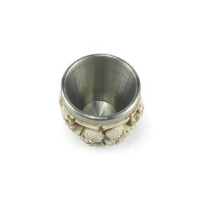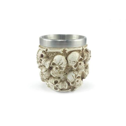 Copo Shot 17 Caveiras, lindo copo com seu interior em aço inox e exterior em resina, confeccionado de modo semi-artesanal, ideal pra quem gosta de tomar um shot com família e amigos, pode ser usado como decoração por conta do fino acabamento e é uma ótima opção para presentear familiares e amigos.