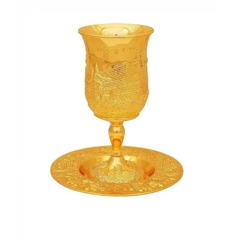 Absolutamente deslumbrante copa do kidush de jerusalém com as muralhas da cidade velha de jerusalém, a torre de davi e 'borei pri hagefen' escrito em hebraico.