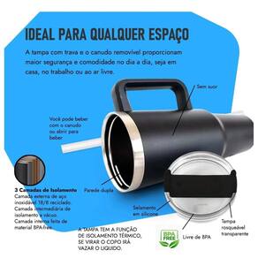 Copo Térmico com Canudo 40oz - Garrafa Térmica Inox Mantenha suas bebidas na temperatura ideal por horas Este copo térmico de 40oz 1,2 litros é a solução perfeita para quem busca praticidade e eficiência térmica. Fabricado em aço inoxidável de alta qualidade com tecnologia de isolamento a vácuo de parede dupla, mantém bebidas quentes por até 8 horas e geladas por até 12 horas. O design ergonômico inclui alça resistente para transporte confortável e seguro. A tampa possui sistema de vedação hermética que evita vazamentos, enquanto o canudo reutilizável proporciona experiência de consumo prática e higiênica. Ideal para academia, escritório, viagens, caminhadas e uso diário. A base antiderrapante garante estabilidade em qualquer superfície. O material inox é livre de BPA, atóxico e não retém odores ou sabores. Especificações técnicas: Capacidade: 40oz 1,2L Material: Aço inoxidável 304 Isolamento: Parede dupla a vácuo Inclui: Tampa com vedação + Canudo reutilizável + Alça ergonômica IMPORTANTE: A cor do produto é e será enviada aleatoriamente conforme disponibilidade em . Você pode receber qualquer uma das cores disponíveis azul, verde, rosa, preto, branco, turquesa, etc. . Todas as cores possuem a mesma qualidade e funcionalidade.