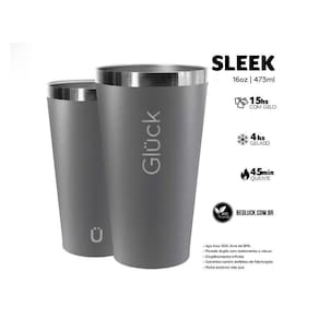 O copo térmico glck sleek 473ml titanium é extremamente resistente, prático e de altíssima qualidade. O principal diferencial do copo térmico sleek 473ml glck é o seu design aliado a uma excelente capacidade térmica. Ele mantém sua bebida quente por até 45 minutos e gelada por até 4 horas. Se você utilizar gelo, vai manter por até 7 horas.Copo térmico gluck sleek titanium em aço inox 473ml suporta 4h geladoo copo térmico gluck sleek titanium em aço inox 473ml suporta 4h gelado é extremamente resistente, prático e de altíssima qualidade.O principal diferencial do copo térmico sleek 473ml glck é o seu design aliado a uma excelente capacidade térmica. Ele mantém sua bebida quente por até 45 minutos e gelada por até 4 horas. Se você utilizar gelo, vai manter por até 7 horas.Com capacidade de 473ml, ele é perfeito para cerveja, chopp, água, café ou qualquer outra bebida que você quiser sempre com você, quente ou gelada.Esse modelo tem design diferenciado, com inspiração escandinava e traços arrojados. Um lindo copo que combina com todos os seus melhores momentos, seja no trabalho, no churrasco, em festas, na academia, de manhã ou à noite, o glck vai estar com você.Outro ponto muito importante é a sua composição, é a construção em aço inox com parede dupla de isolamento. Essa é a tecnologia que proporciona a capacidade térmica do seu copo.Além de tudo, ele é livre de bpa. O bpa bisfenol a é uma substância química presente na maioria dos plásticos e polímeros, e é comprovadamente nociva à saúde. Por isso, escolha um copo que se preocupe com a sua saúde e bem-estar.Pra cuidar do seu copo glck e mantê-lo sempre novinho em folha, lave somente com água e sabão e não utilize produtos químicos abrasivos.Se você procura por uma marca que faça a diferença, por um acessório feito pra durar uma vida, por qualidade, praticidade e durabilidade, por alegria e bons momentos, pode parar de procurar, é só apostar na glck.A glck nasceu nos estados unidos. Lá, a utilização desse tipo de copo seja no trabalho, em viagens ou mesmo para lazer é muito valorizada, tanto pela praticidade e qualidade que proporciona quanto pela diminuição de resíduos plásticos na natureza.A marca preza por enaltecer os bons momentos, sejam eles quais forem. O lema é be glck. Ser glck não se limita a ter ou usar os produtos, mas sim ter personalidade, ser diverso, múltiplo e ter a consciência de escolher uma marca que se preocupa com o impacto ambiental e com o planeta. Especificações técnicas:marca: glckmodelo: copo térmico sleek cor: titaniumcapacidade: 473mlmaterial: aço inox 304- parede dupla com isolamento á vácuo- empilhamento infinito- parte externa não suatérmica quente: 45mintérmica fria: até 4hgelo: até 15hlivre de bpadimensões do produto axcxl : 14,6 x 8,7 x 8,7cmpeso: 190g