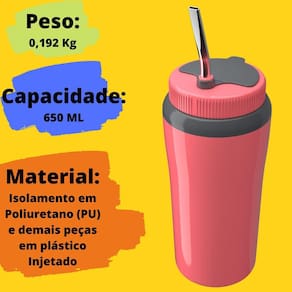 Modelo: copo térmico tereré Capacidade: 650ml Dimensões: 20 (a) x 8 (l) x 8 (c) cm Eficiência térmica: 4 a 5 horas Material do interior: parede dupla em poliuretano Material do exterior: polipropileno Material do canudo: aço inoxidável