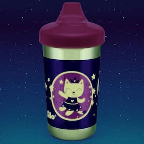 O Copo Antivazamento Glow Max de 320ml da Lillo tem uma tecnologia que Brilha no Escuro e assim é encontrado muito facilmente durante a noite, sem a necessidade de acender a luz.