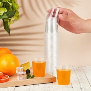-?Durável e conveniente?O design único de copos de plástico transparente de 3 onças facilita a limpeza após um intenso serviço de jantar. A borda ondulada da parede evita que escorregue e derrame.
