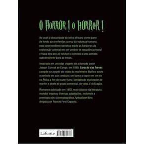 Ao Usar a obscuridade da selva africana como pano de fundo para reflexões acerca da natureza humana , esta surpreendente narrativa expõe as barbáries da exploração colonial em um cenário de decadência moral e física dos que habitam e convida a uma jornada subconsciente para trevas . Romance publicado em 1902, este clássico da literatura mundial espirou diversas adaptações , incluindo a premiada obra de cinematográfico Apocalipse Now, dirigida por Francis Ford Coppola Ean: 9786558701378