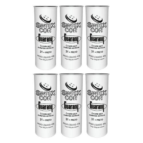 Lembre-se que um tubete é suficiente para 300 gramas de tecido, ou seja, divida o peso da roupa em gramas por 300 e obtenha quantos tubetes serão necessários. Exemplo: 900/300 = 3 tubetes Biquini - 100g - 1/3 Calça Adulto - 700g - 2 e 1/3 Calça Jeans - 800g - 2 e 2/3 Calça Jeans Infantil - 450g - 1 e 1/2 Camiseta 1/2 Manga - 100g - 1/3 Camiseta Regata - 80g - 1/4 Fronha - 180g - 2/3 Lençol Casal - 500g - 1 e 2/3 Lençol Solteiro - 300g - 1 Maiô - 200g - 2/3 Short - 100g - 1/3 Sunga - 50g - 1/6 Toalha Banho - 800g - 2 e 2/3 Toalha Rosto - 180g -2/3 Especial para tingir peças de acrílico com exceção dos corantes 90-Dourado e 91-Prateado e acetato para segmentos de moda e decoração. Instruções de uso: 1 Dissolva o Sintexcocor em água fervente. 2 Misture o Sintexcor dissolvido em um recipiente com água quente o suficiente para cobrir a peça a ser tingida. 3 Lave a peça e, ainda úmida, mergulhe no banho de tingimento, mexendo sempre por 30 minutos. Mantenha sob fervura. 4 Retire a peça do banho e enxágue bem em água corrente. 5 Coloque no Fixacor por 30 minutos, seguindo as instruçõesda embalagem. Indicação: Recuperação de roupas, tie dye, customização, artesanato, decoração, etc. Peso líquido: 40g Quantidade de tecido seco: 300g Itens do pacote: 06 Sintexcor Preto 40g;
